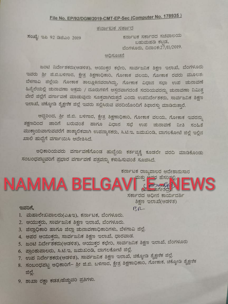ಗೋಕಾಕ ಉಪ ಚುನಾವಣೆ ಹಿನ್ನಲೆಯಲ್ಲಿ ಇಲ್ಲಿನ ಕ್ಷೇತ್ರ ಶಿಕ್ಷಣಾಧಿಕಾರಿ ಜಿ.ಬಿ.ಬಳಗಾರ ಅವರನ್ನು ವರ್ಗಾವಣೆ ಗೋಳಿಸಿ ಪ್ರಧಾನ ಕಾರ್ಯದರ್ಶಿಗಳು ಸಾರ್ವಜನಿಕ ಶಿಕ್ಷಣ ಇಲಾಖೆ ಬೆಂಗಳೂರು ಇವರು ಆದೇಶ ಹೊರಡಿಸಿದ್ದಾರೆ