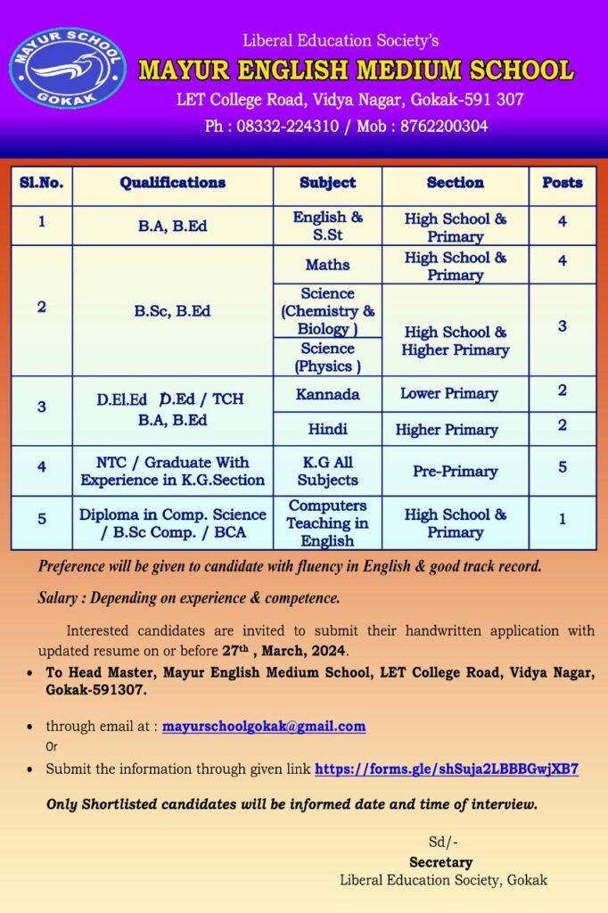ಗೋಕಾಕ:ಶಿಕ್ಷಕರ ಹುದ್ದೆಗೆ ಅರ್ಜಿ ಆಹ್ವಾನ! ಇಲ್ಲಿದೆ ಹುದ್ದೆಯ ಸಂಪೂರ್ಣವಾದ ಮಾಹಿತಿ!